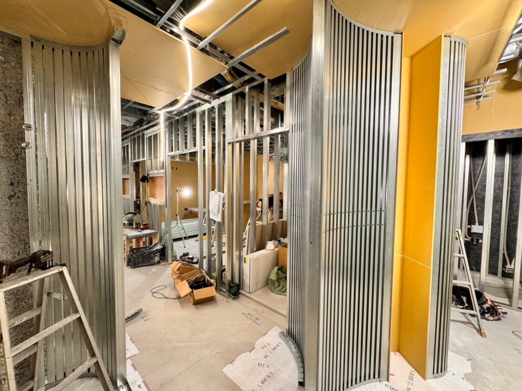 LGS(軽量形鋼)という亜鉛メッキ鋼板でできた材料を使用し下地を作り、ボードを貼る工事。駅や空港、病院などの公共施設やビルなどの壁や天井を作っていきます!軽い鉄を切るなどの加工、組立や取付け、ボード貼りがメインの作業です。